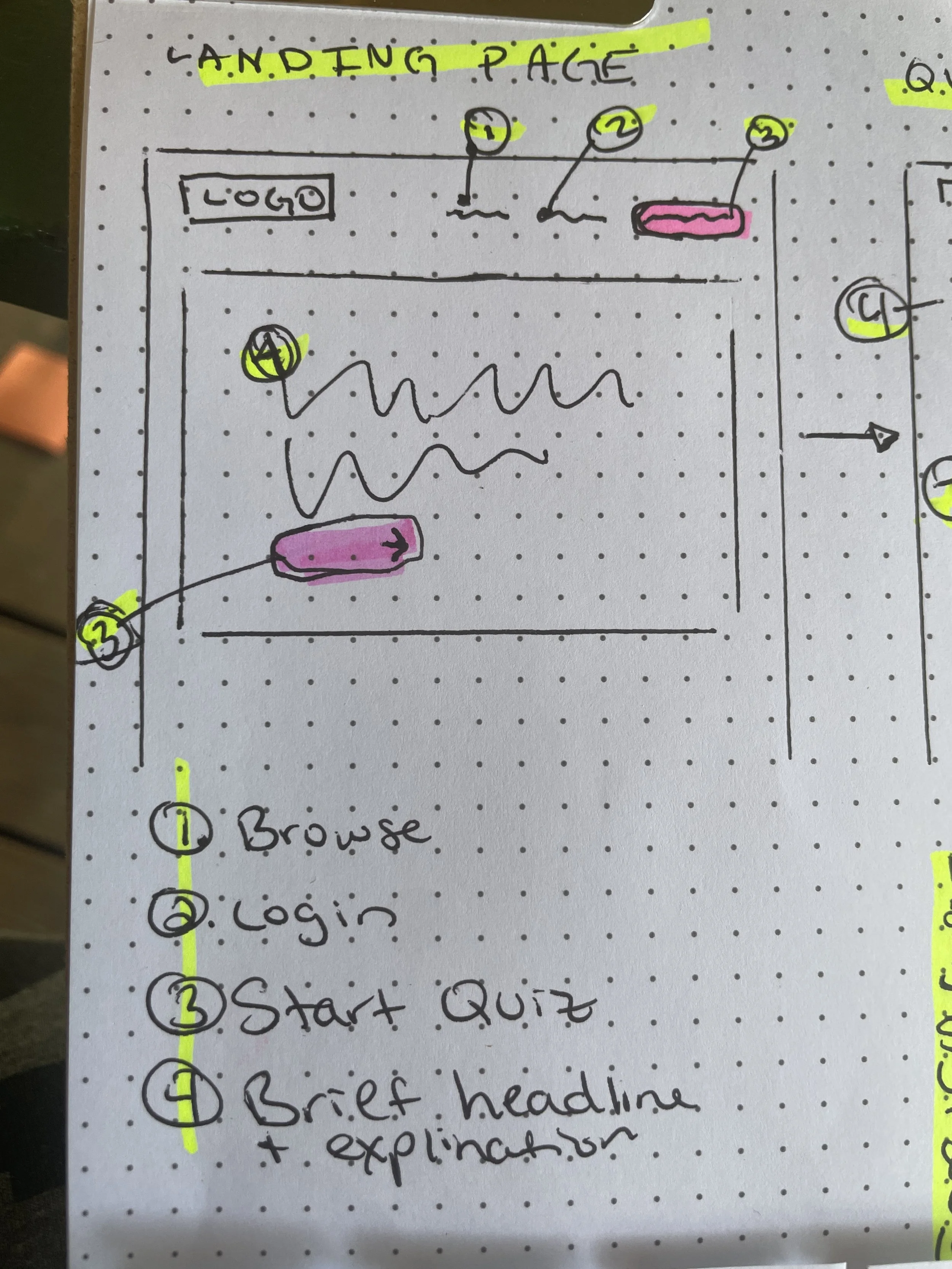 I took all the original features I’d dreamed up and put them in a sitemap as a prioritization exercise. Comparing that to the user journey allowed me to narrow the features into a Minimum Viable Product and guide my progress as I moved on to the Lo Fi Wireframes.