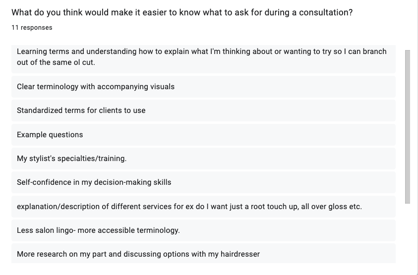 Before the interview, the survey highlighted the majority of users are utilizing google searches to find hairstyle inspiration and are most often frustrated because they aren’t sure how to search for what they are picturing in their mind. During the interviews, the main themes were effective communication, trust, and personal customization. The most common anxiety among users was a fear of not being heard or understood.