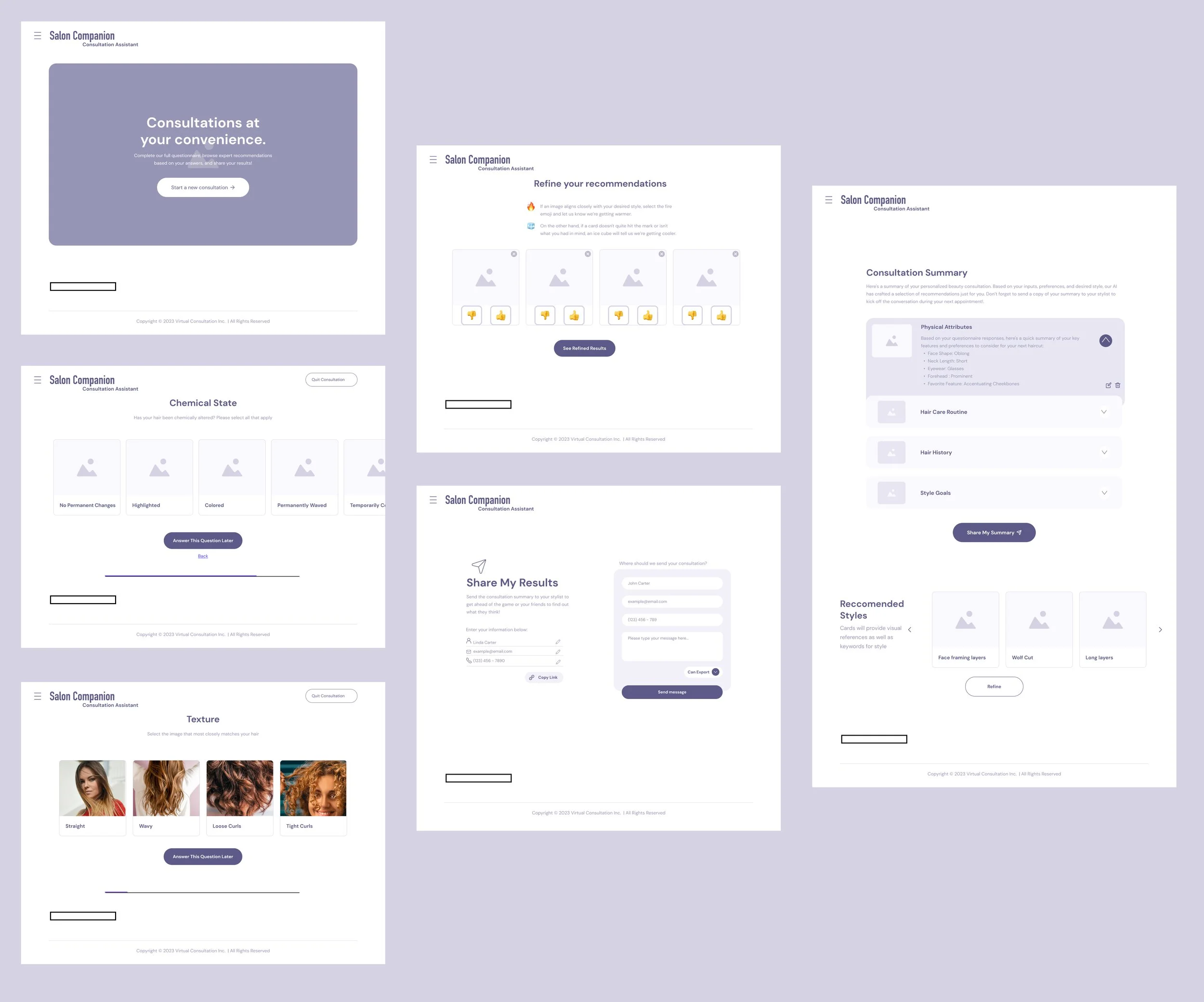 Consultation Summary: A summary of clients' input, preferences, and recommended styles can be generated and shared with the stylist virtually or during the consultation.